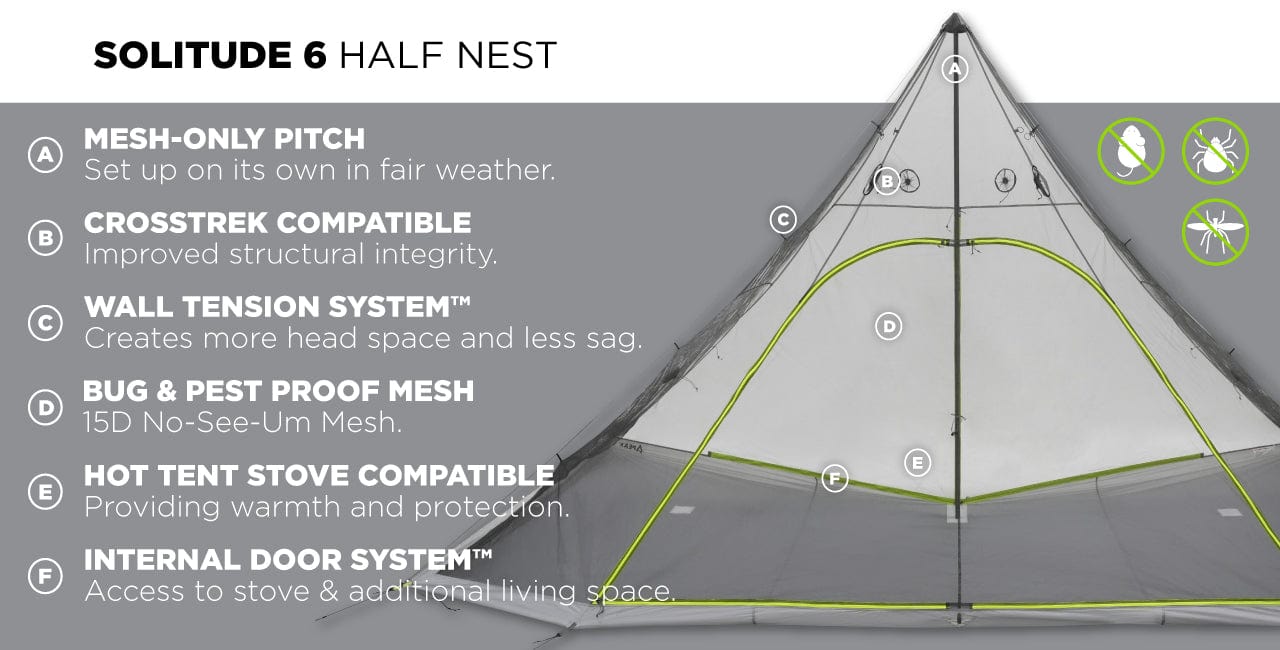 The PEAX Solitude 6 Half Nest offers full protection from bugs and ground-based critters while preserving a large open area inside the shelter. Designed for 3-4 hunters, it creates a clean, enclosed sleep zone while leaving room for gear, firewood, and stove, making it an ideal choice for added comfort on extended trips.
